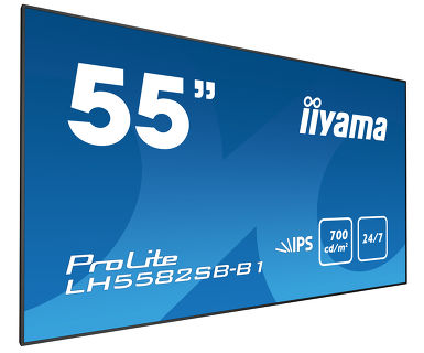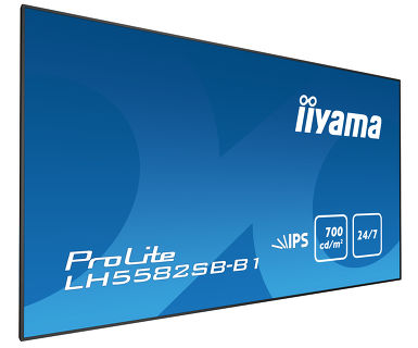The ProLite LH5582SB-B1 professional large format display is the ideal digital signage solution for companies that want maximum impact and maximum flexibility. The slim design and ultra-thin metal bezel combined with the higher-brightness – 700cd/m2 – IPS panel, 24/7 operating time and landscape/portrait orientation ensures optimal fit in almost any digital signage set-up, incl. video walls. The LED-backlit technology guarantees low power consumption and together with the active cooling ensures a reliable long-term operation. It can be operated via LAN network, RS232 or via an OPS plug-in PC.